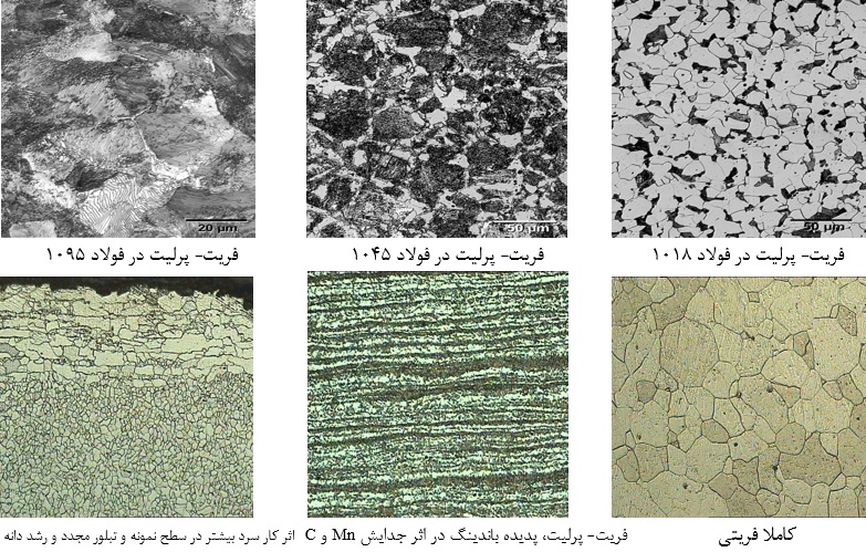 - فاز فريت: عمدتاً به صورت روشن با مرز دانههاي مشخص بوده و با محلول نايتال ۲% ظاهر ميشود.
