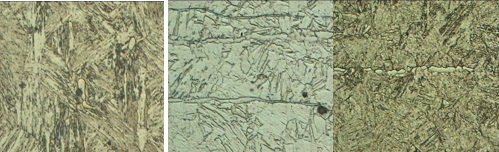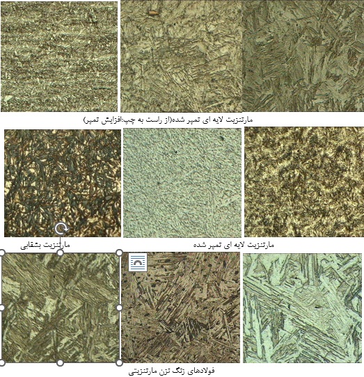 - فاز مارتنزيت: بسته به تركيب شيميايي (بالاخص درصد كربن)(۶/۰-۰:لايه اي، ۱-۶/۰:مخلوط و ۶/۰< :بشقابي) و سرعت سردشدن عمدتاً به دو صورت لايهاي و بشقابي ظاهر ميشود. در ساختار لايهاي به صورت تيغههاي موازي, در بستههاي مختلف آشكار ميشود. ساختار بشقابي به شكل تيغه هاي ضخيم و منفرد عمدتاً همراه با آستنيت باقيمانده در بين تيغهها ظاهر ميشود.